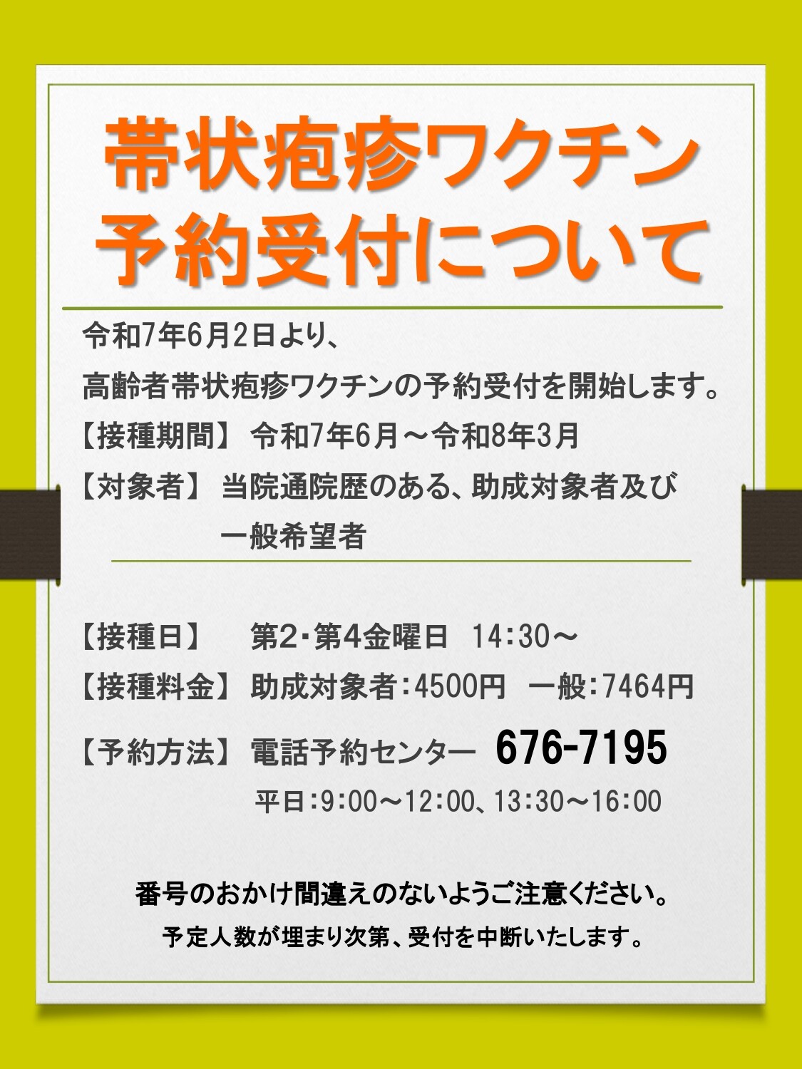 令和7年4月より、帯状疱疹ワクチン予約受付をしております